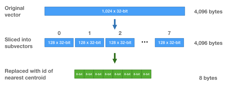 每个子部分只有 256 个质心,所以仅需 8 比特就能存储一个质心 ID。每个向量,原本包含 1024 个 32 浮点数(4,096 字节),现在仅是 8 个 8 比特整数的序列(每个向量只要8字节的存储空间!)。