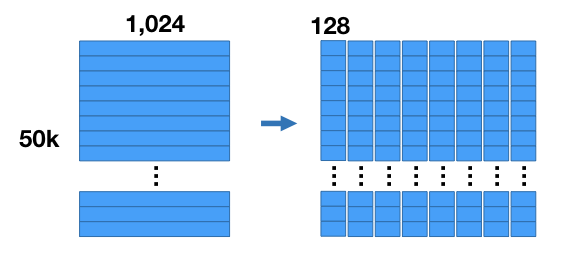 压缩的原理如下所述:对于我们的示例数据集,将所有向量一起切成8个子向量,每个子向量的长度为 128(8个子向量 每个子向量128维 = 原始向量的 1024 维)。这样就将数据集分成8个矩阵,每个矩阵大小为 。