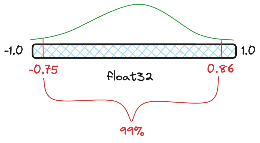 分位点(quantile) 是指数值分布的一个切片,这个切片包含一定数量比例的值。例如:一种浮点数取值分布下 99% 的值落在 这个分位点区间内,小于 和大于 的值都被视为离群值/异常值(outliers),因此将 和 分别视为实际的最小值和最大值。如果量化时将离群值包含在内,就意味着那些最常见的值可用的桶偏少了,可用桶少了也就意味着精度更差,信息损失更多。